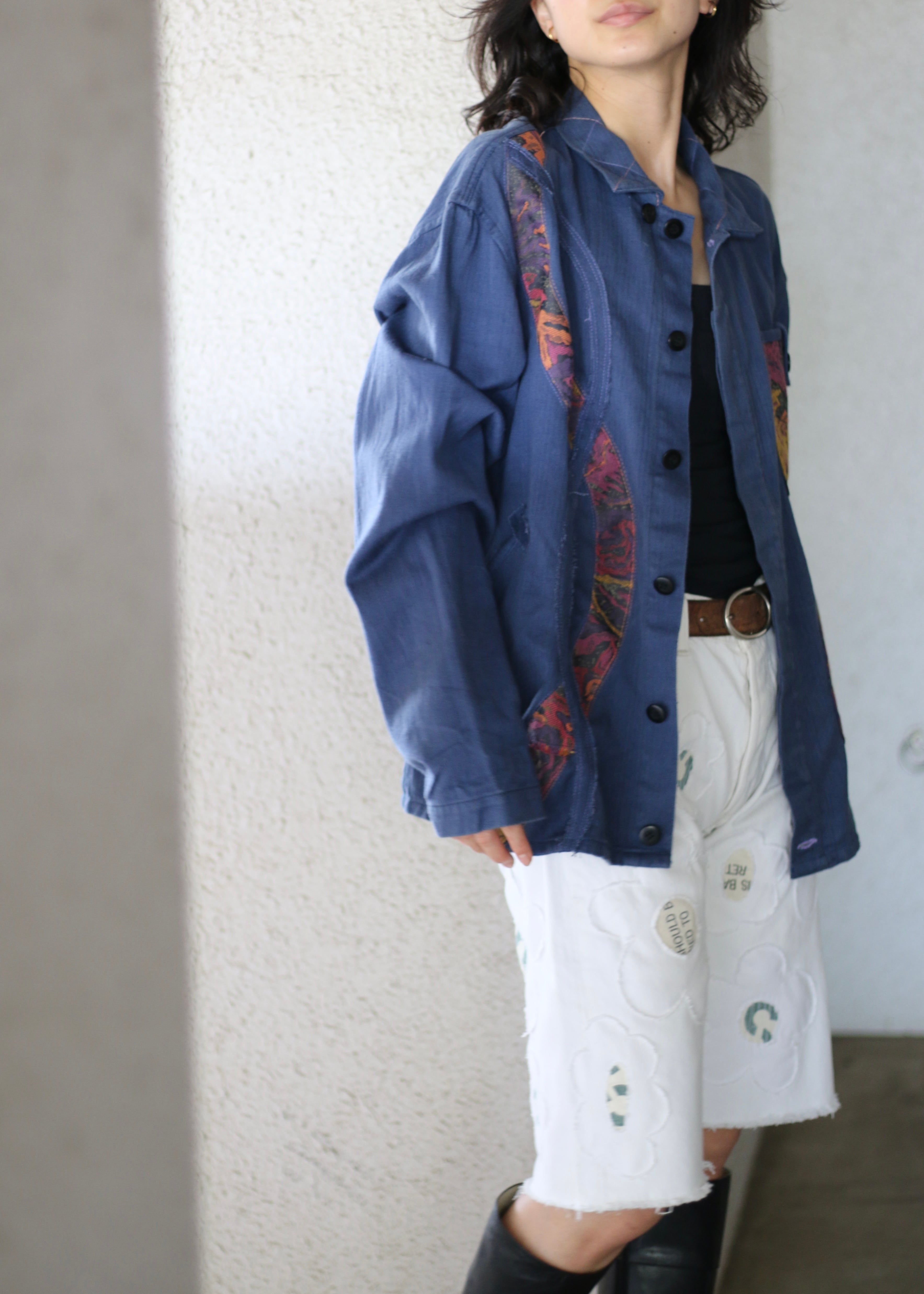 ヘリンボーンツイルのビンテージフレンチワークジャケットを、ハンドポケット、胸ポケットを取り付けて気の利いたデイリーユース向け仕様に編集しております。