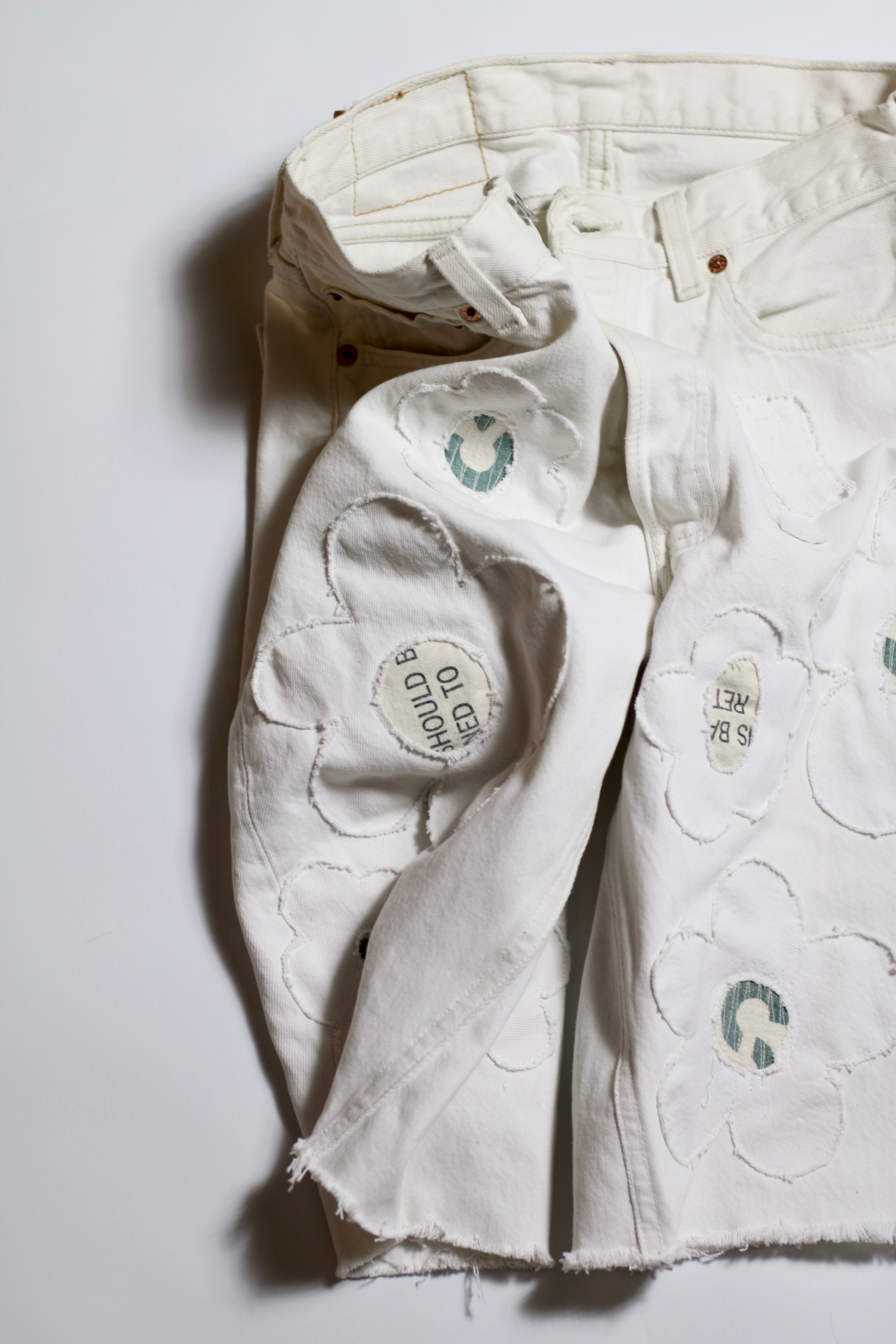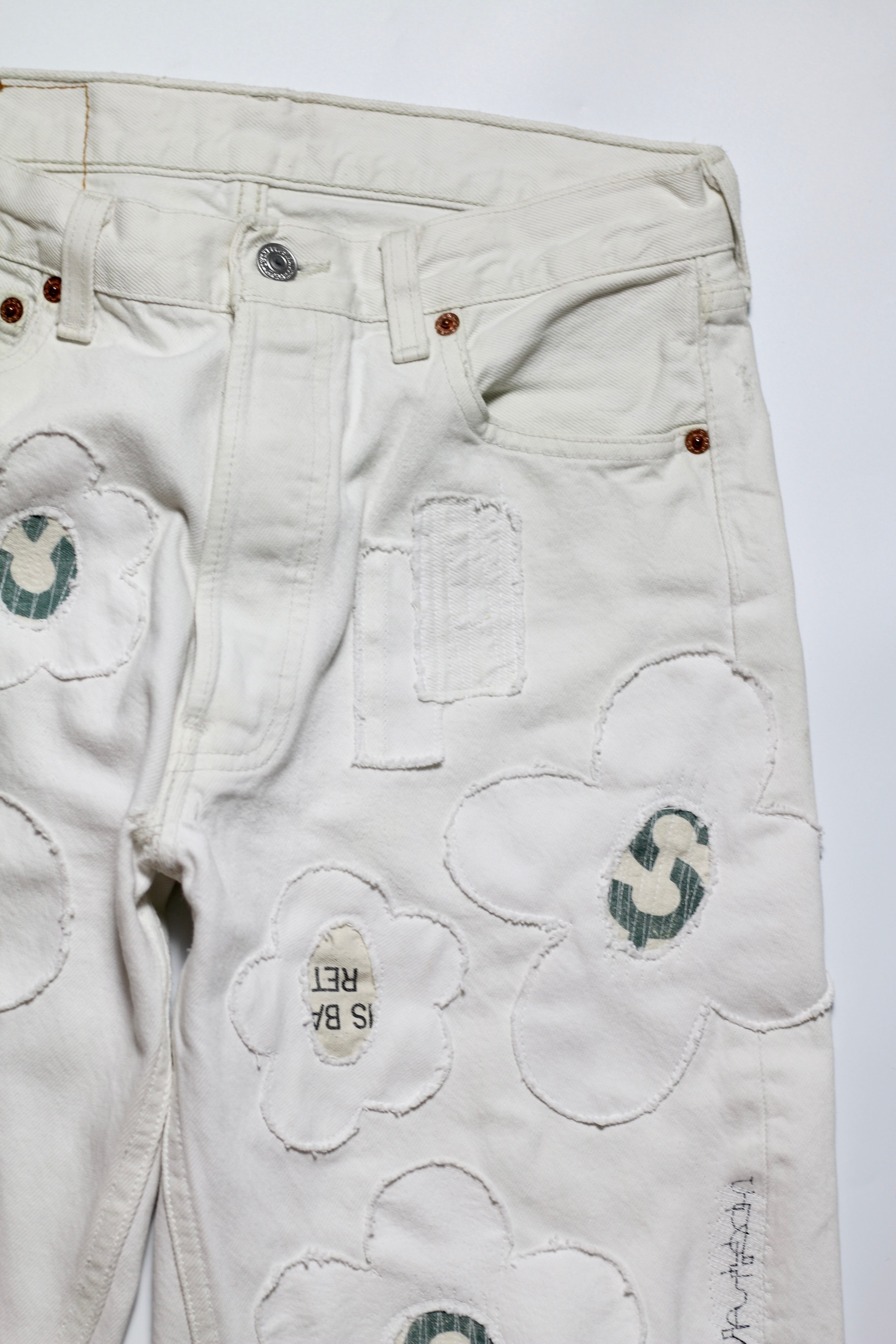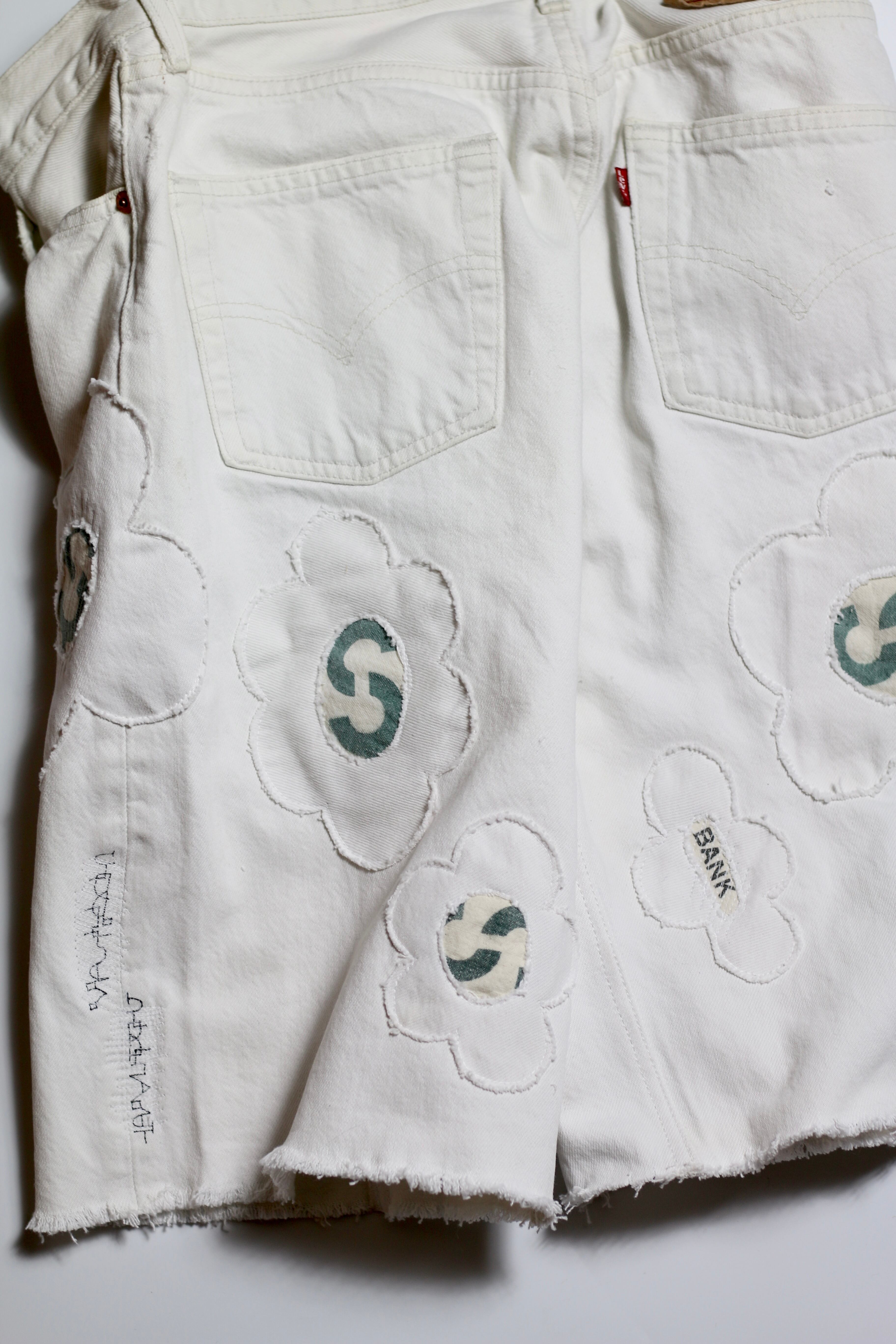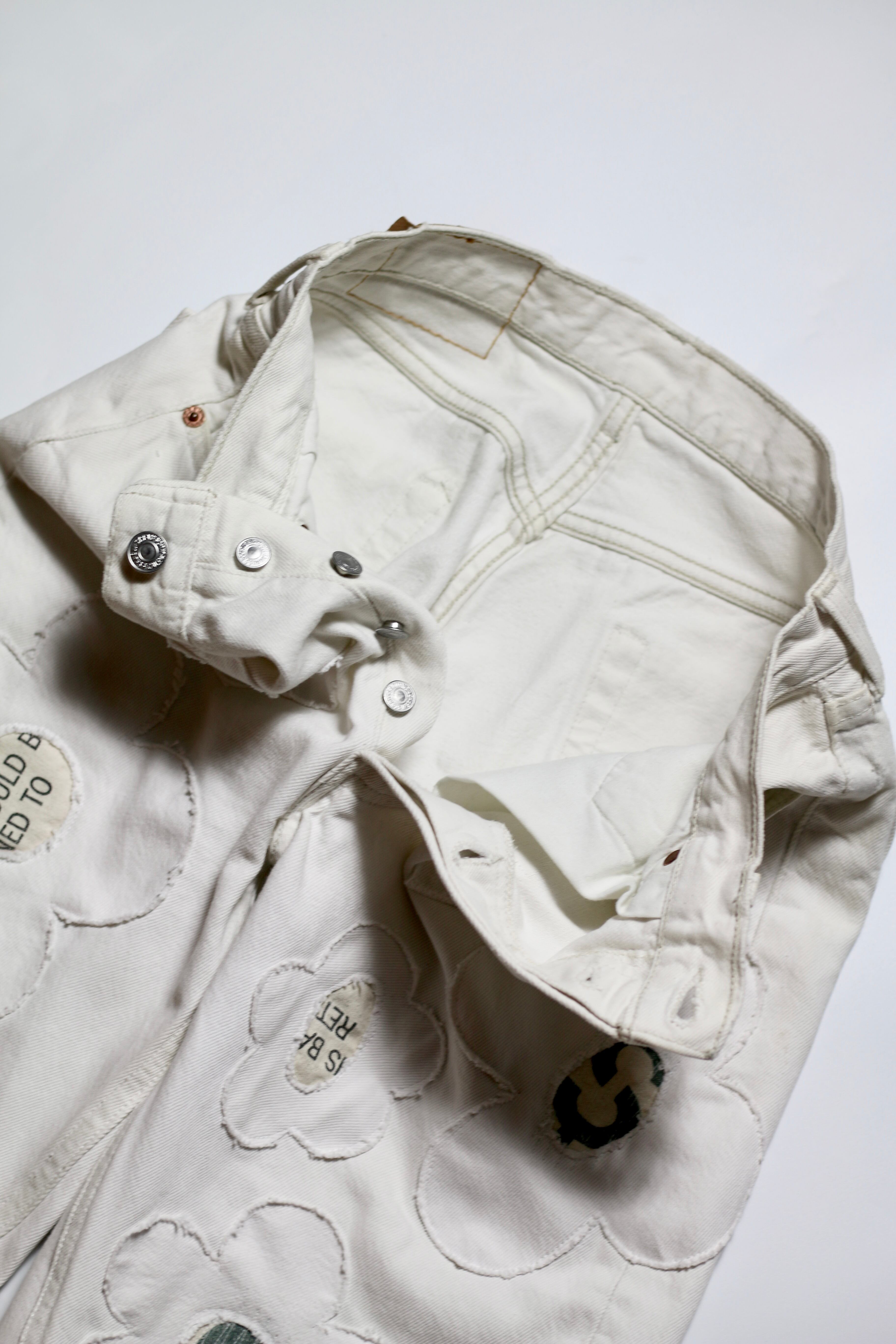 Levi's 501 ホワイトデニムをカットオフ、フリンジ加工、裾幅を若干広める事でバランスのとれたシルエットに加工しております。