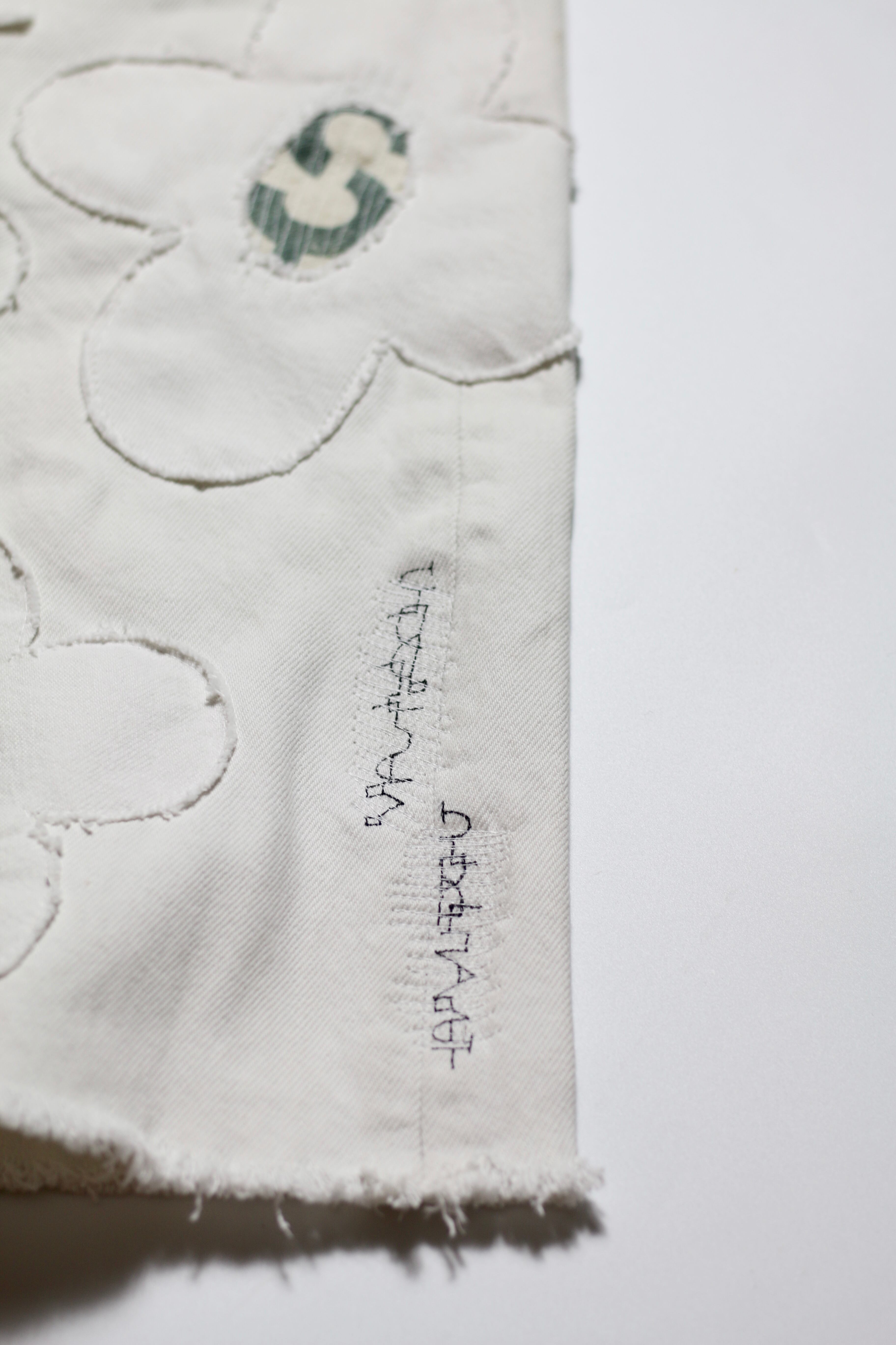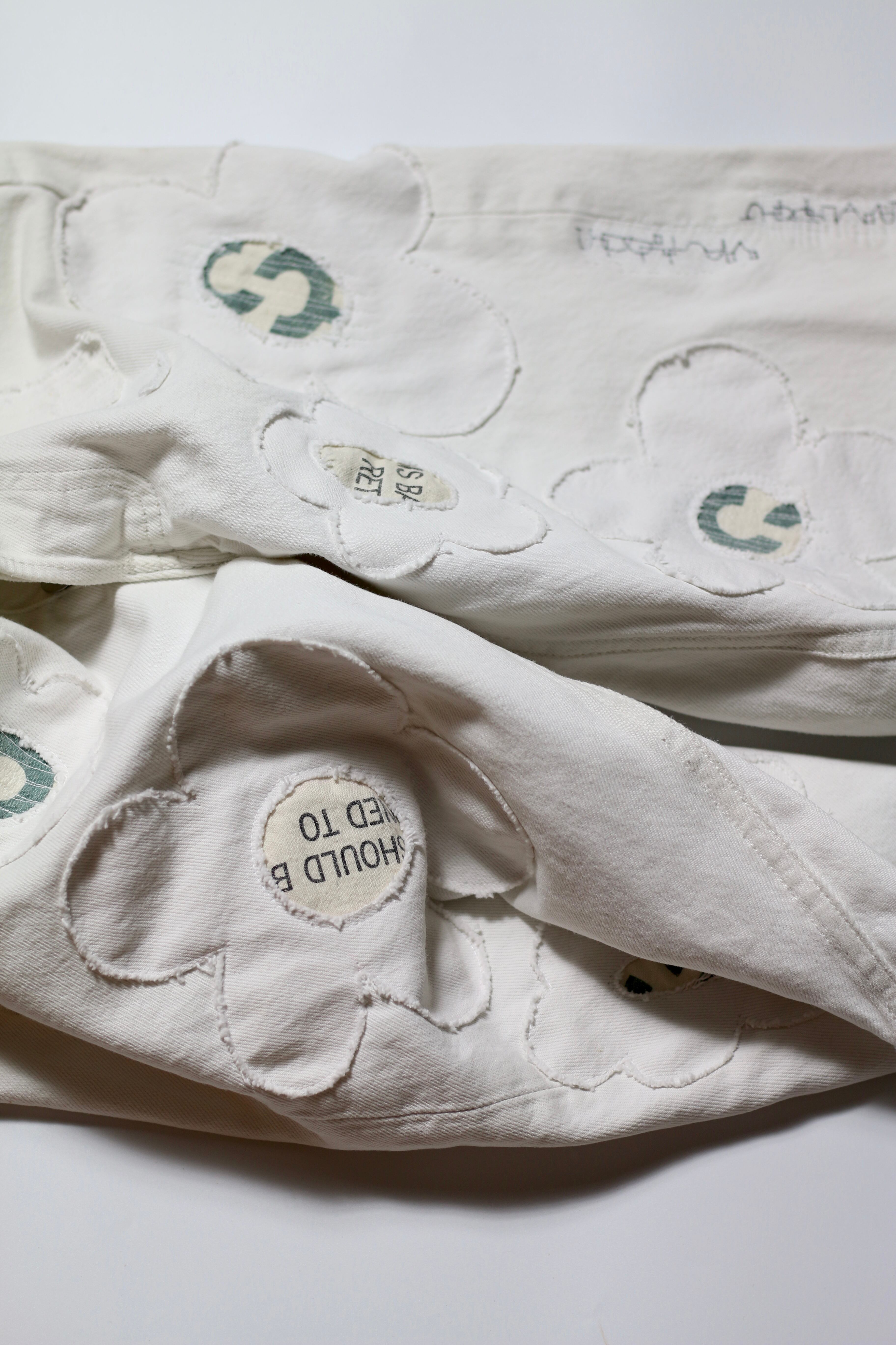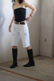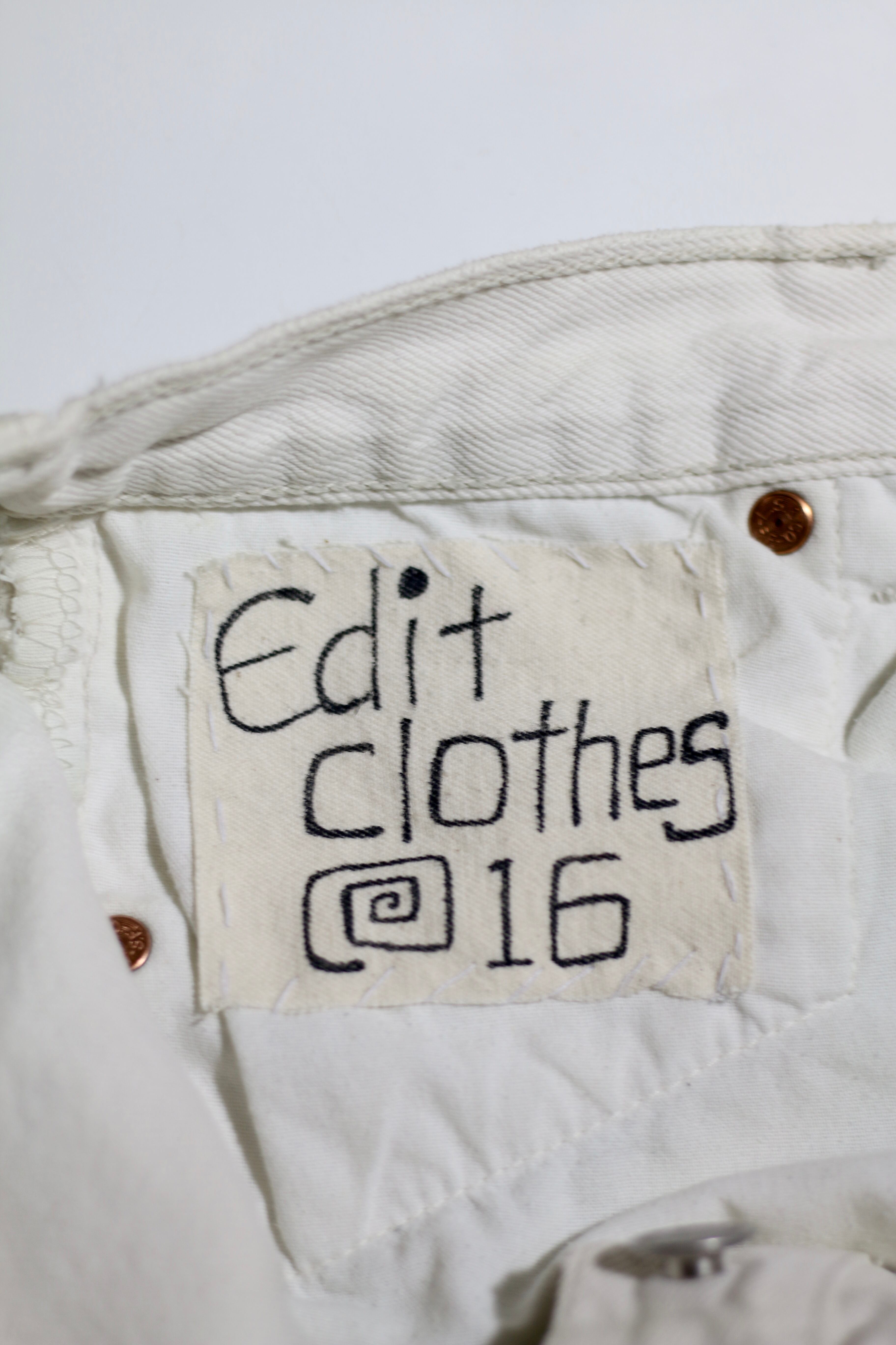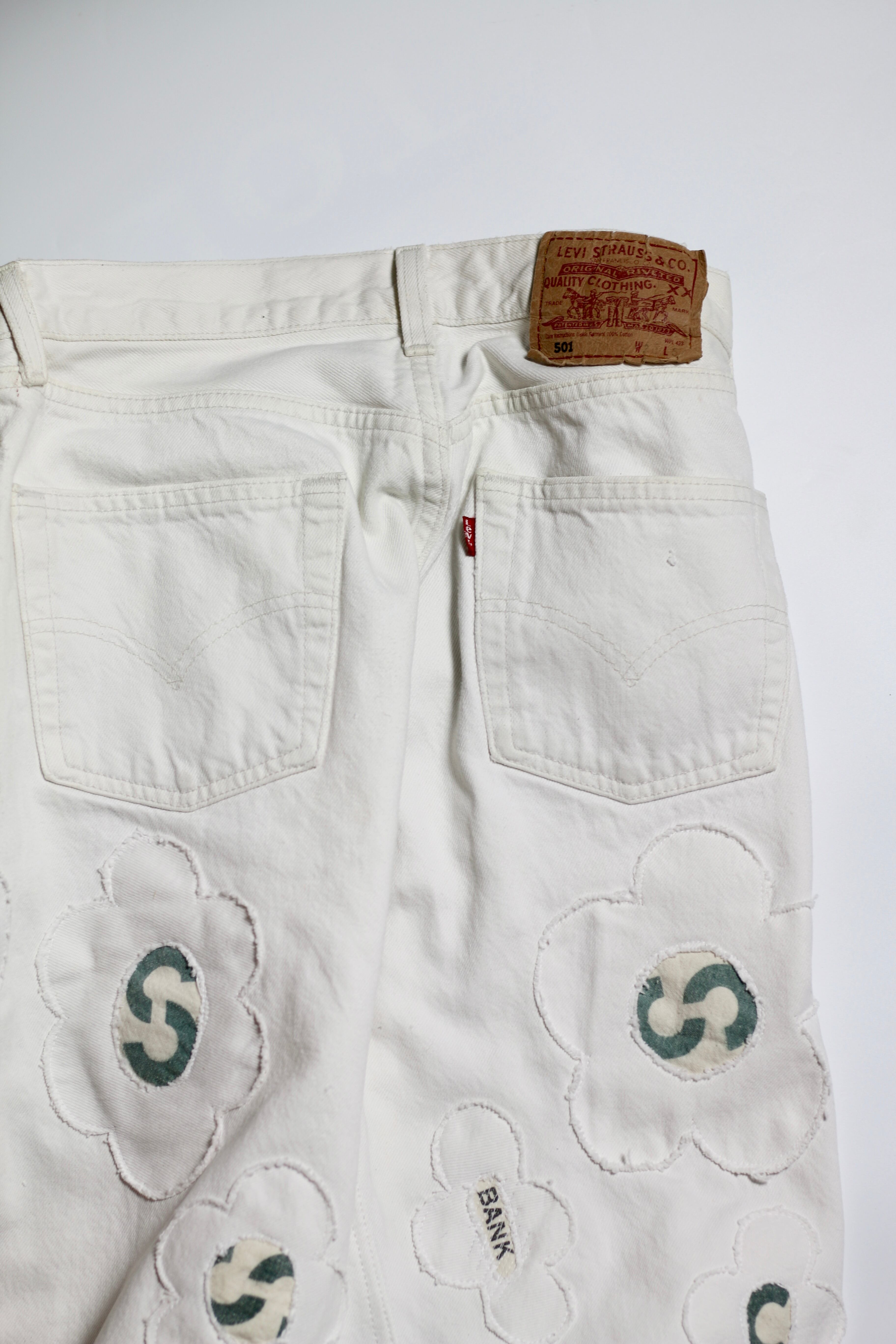 Levi's 501 ホワイトデニムをカットオフ、フリンジ加工、裾幅を若干広める事でバランスのとれたシルエットに加工しております。