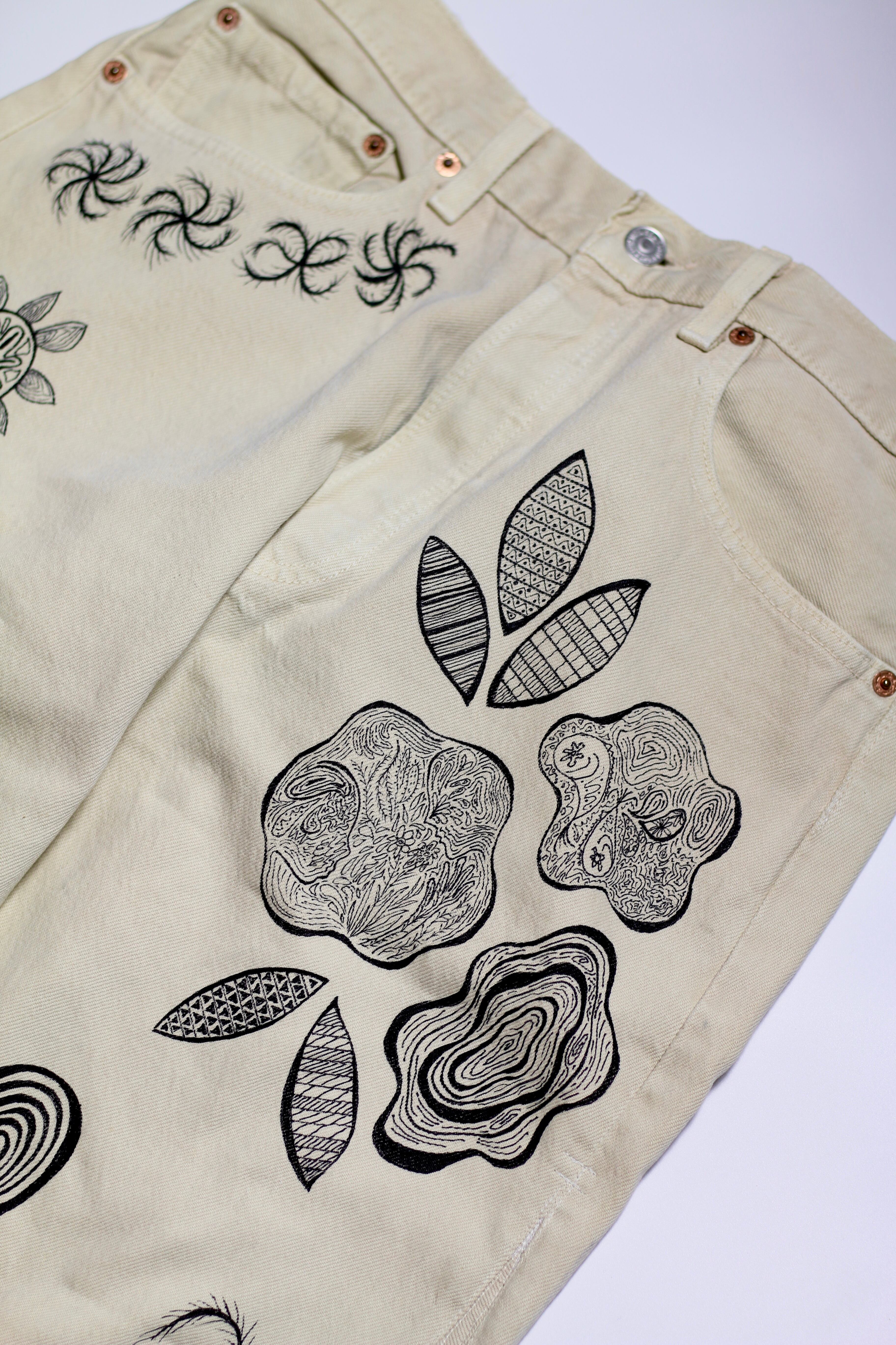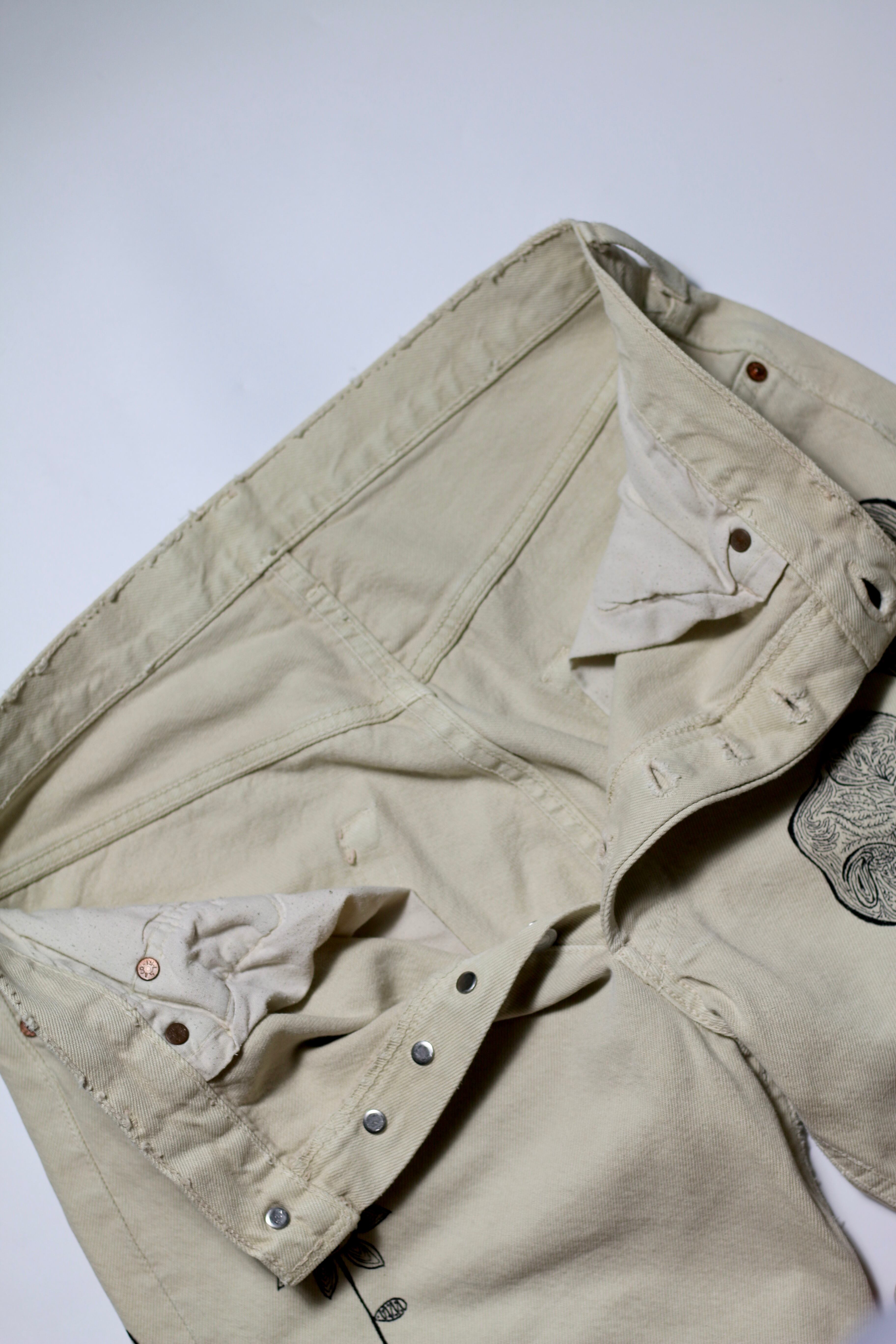 Levi's 501 カラーデニムをカットオフ、フリンジ加工、裾幅を若干広める事でバランスのとれたシルエットに加工しております。