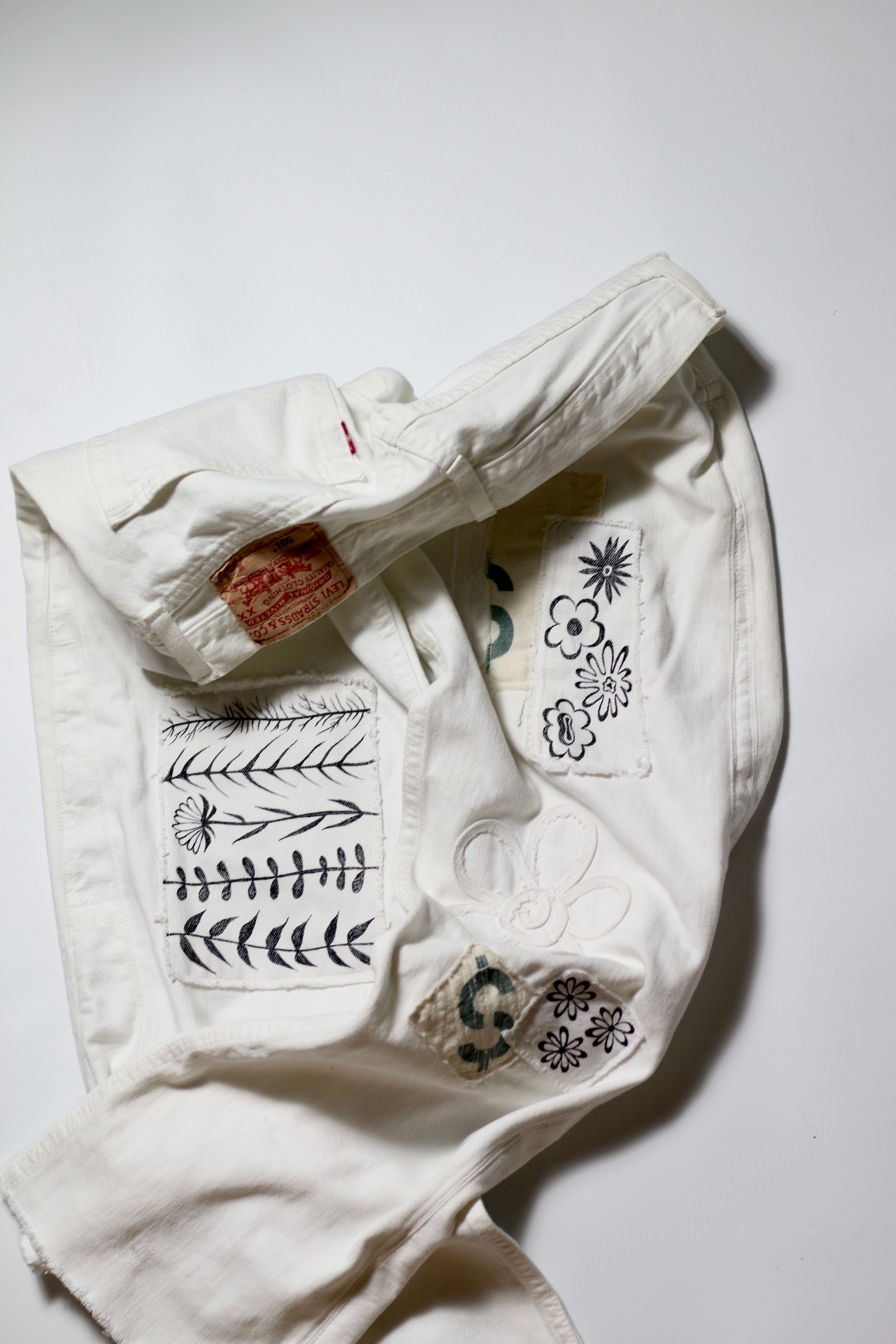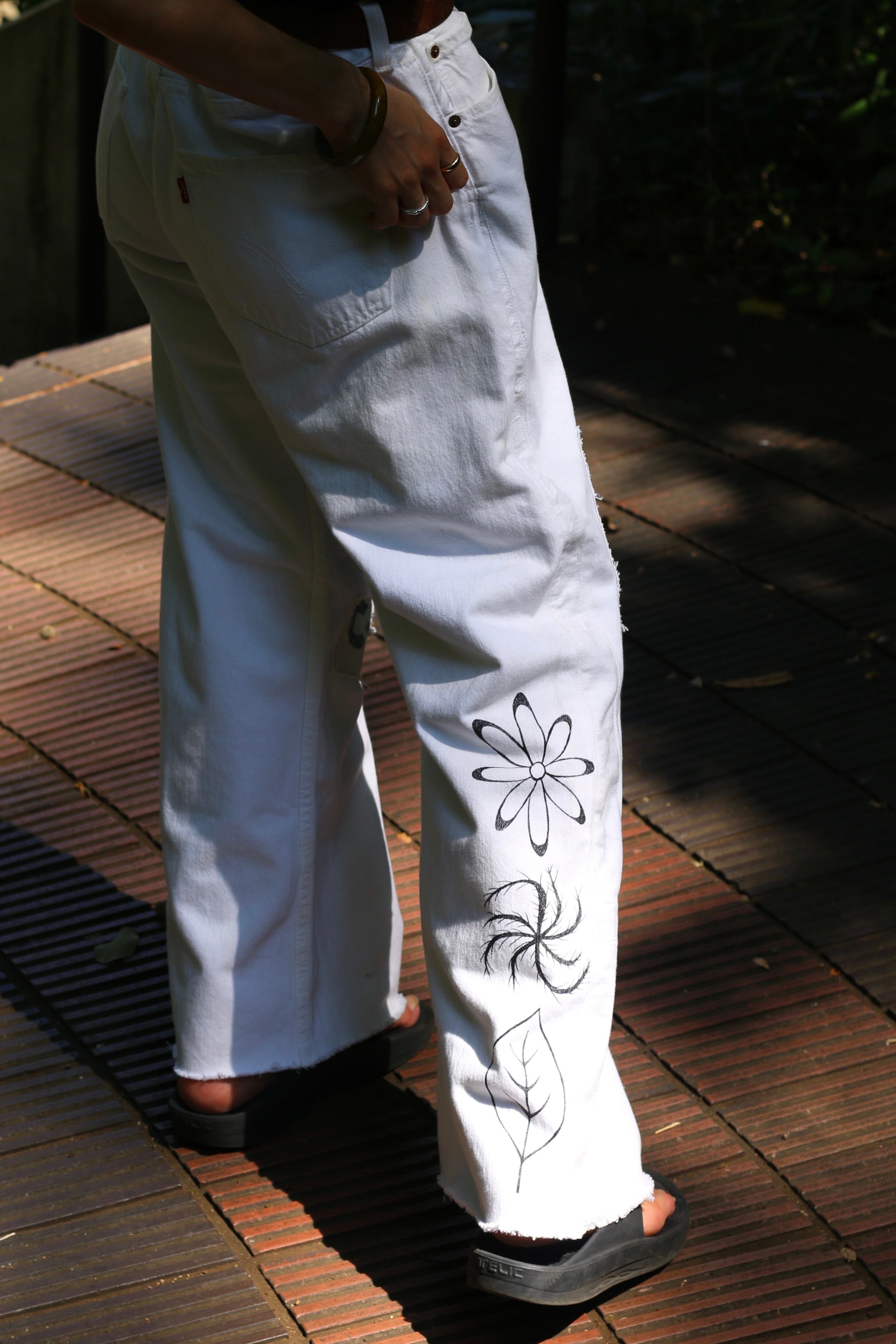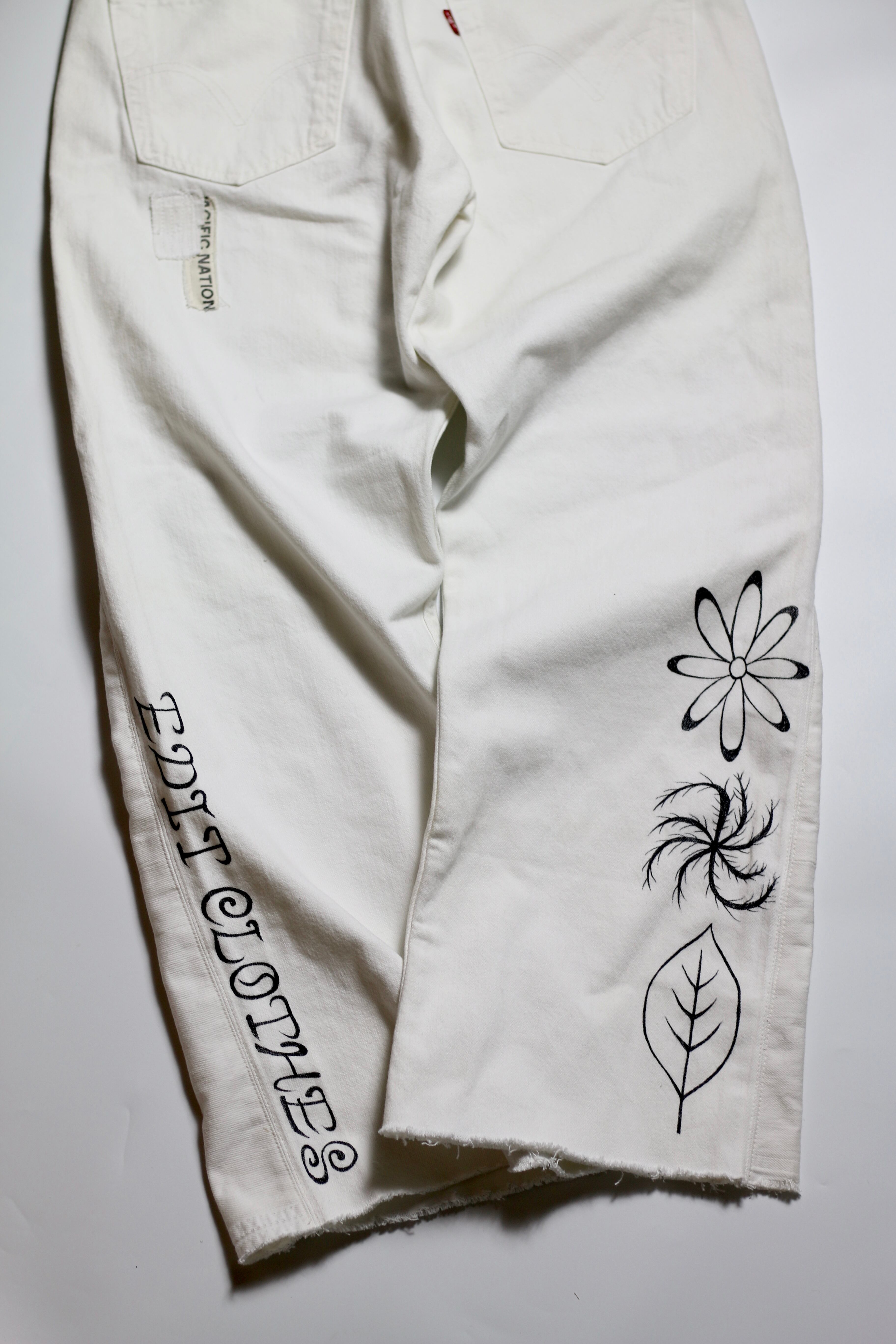 Levi's 501 ホワイトデニムをカットオフ、フリンジ加工、