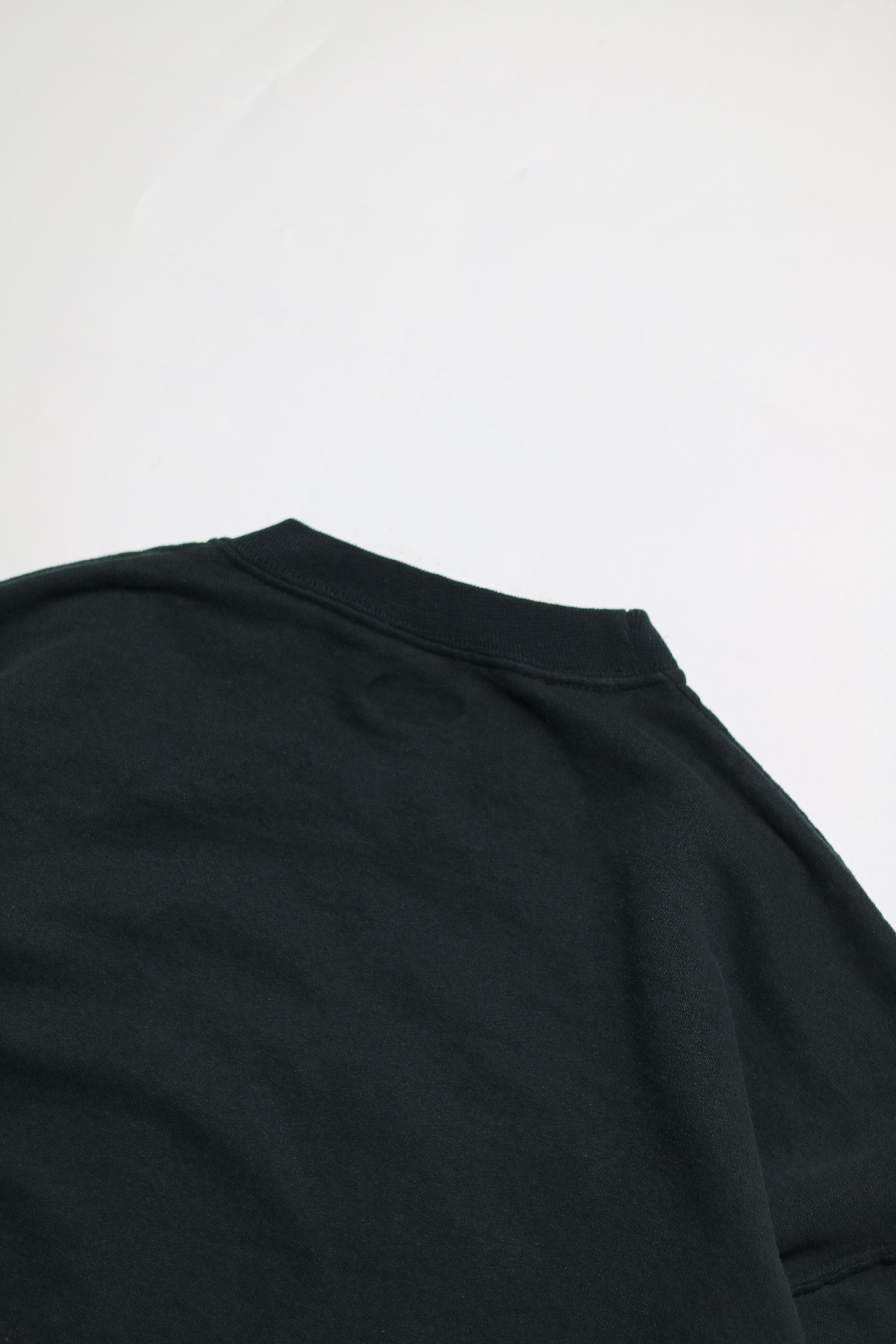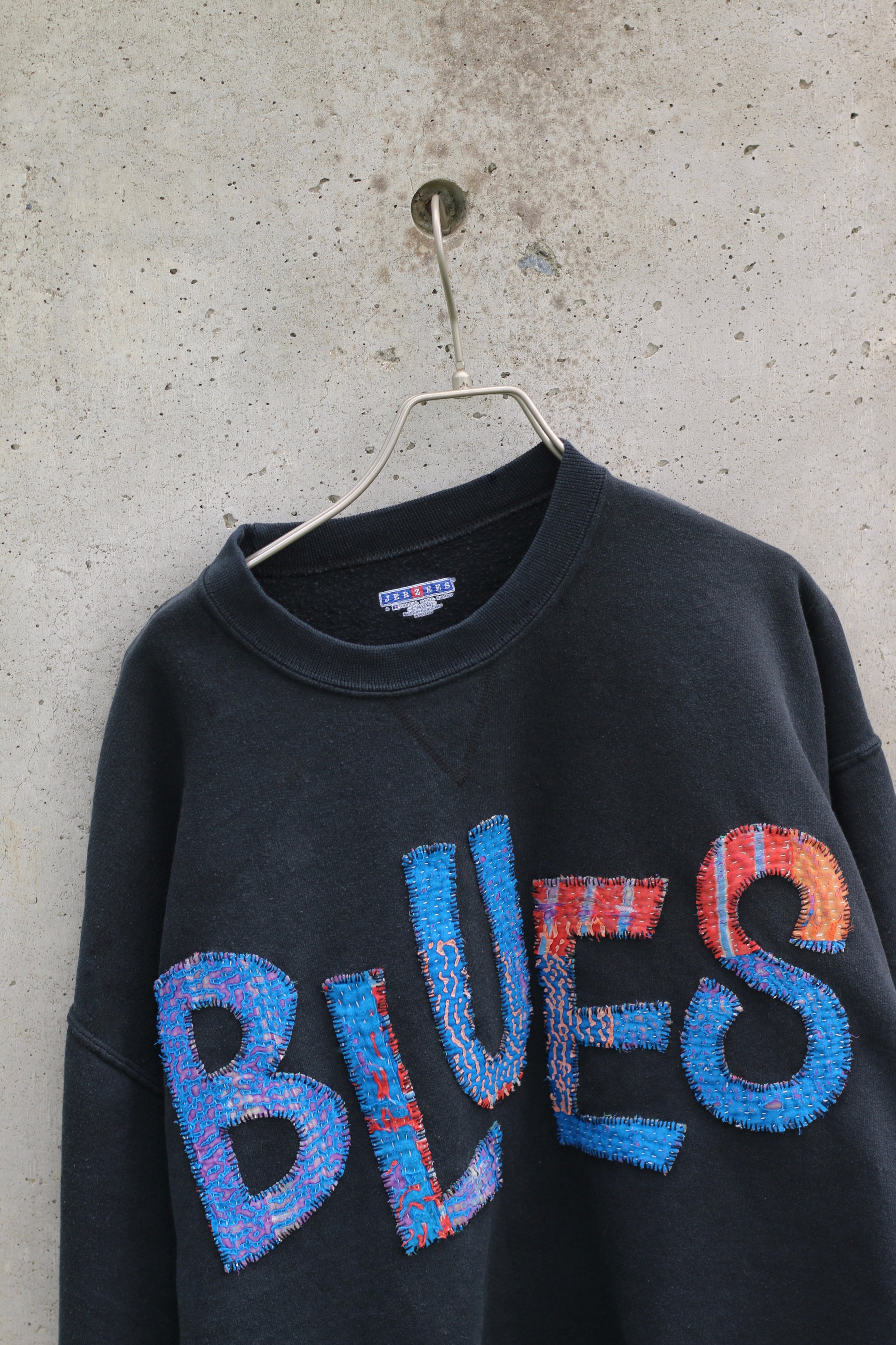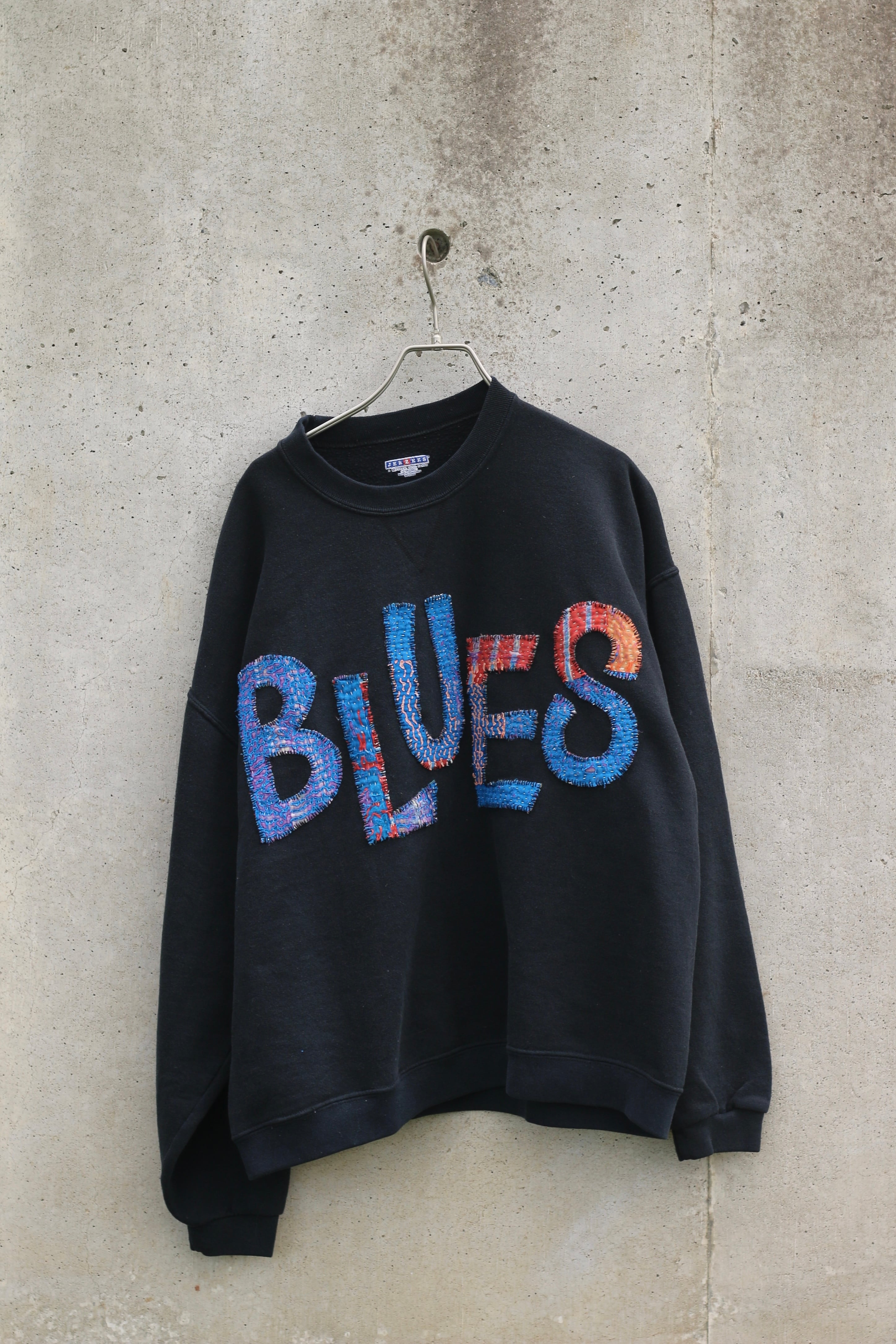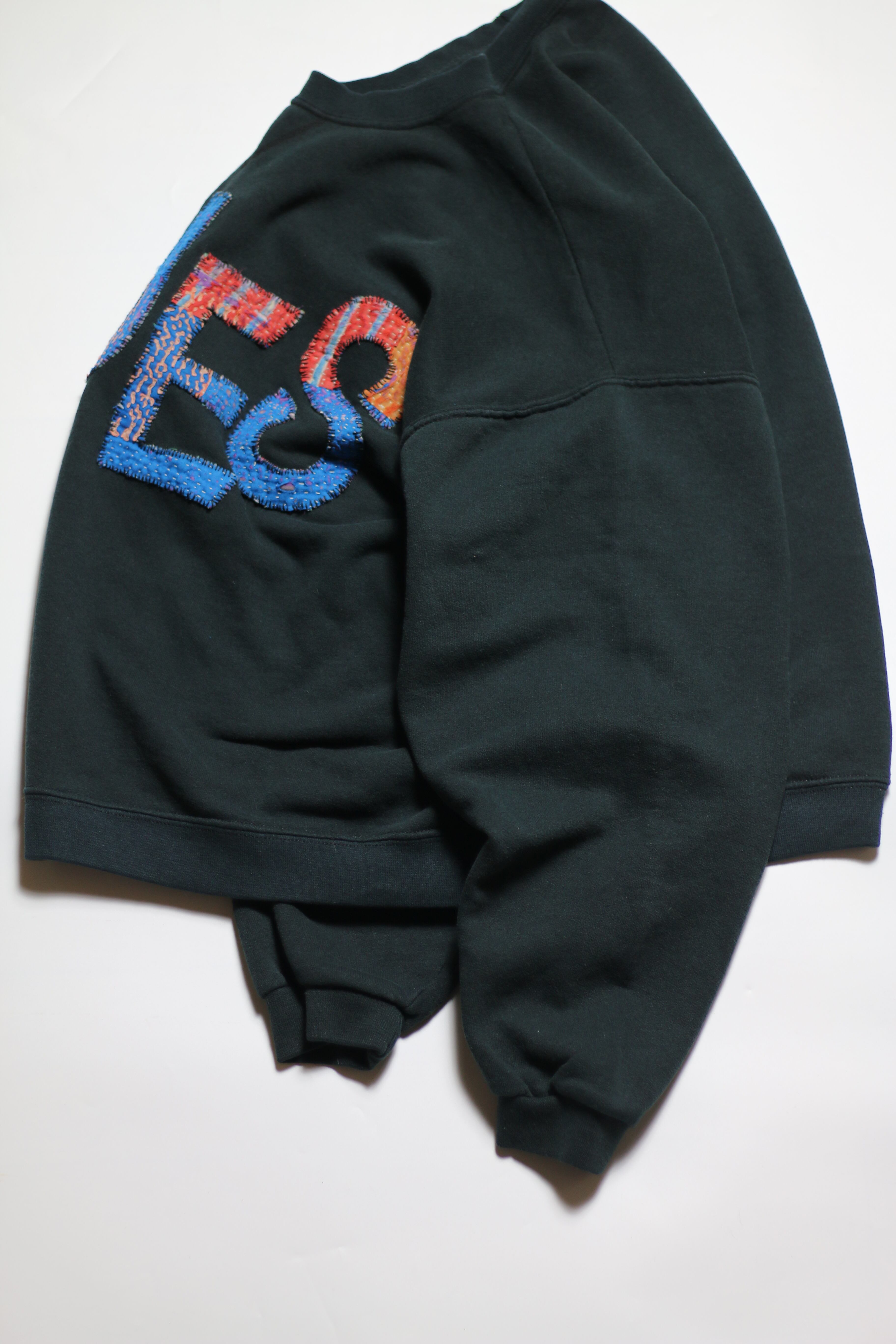 インド綿の端切れを捨てずにツギハギして作られた伝統的な刺し子刺繍生地カンタキルトをブラックの古スウェットに手縫いで縫い付けた一点モノです。