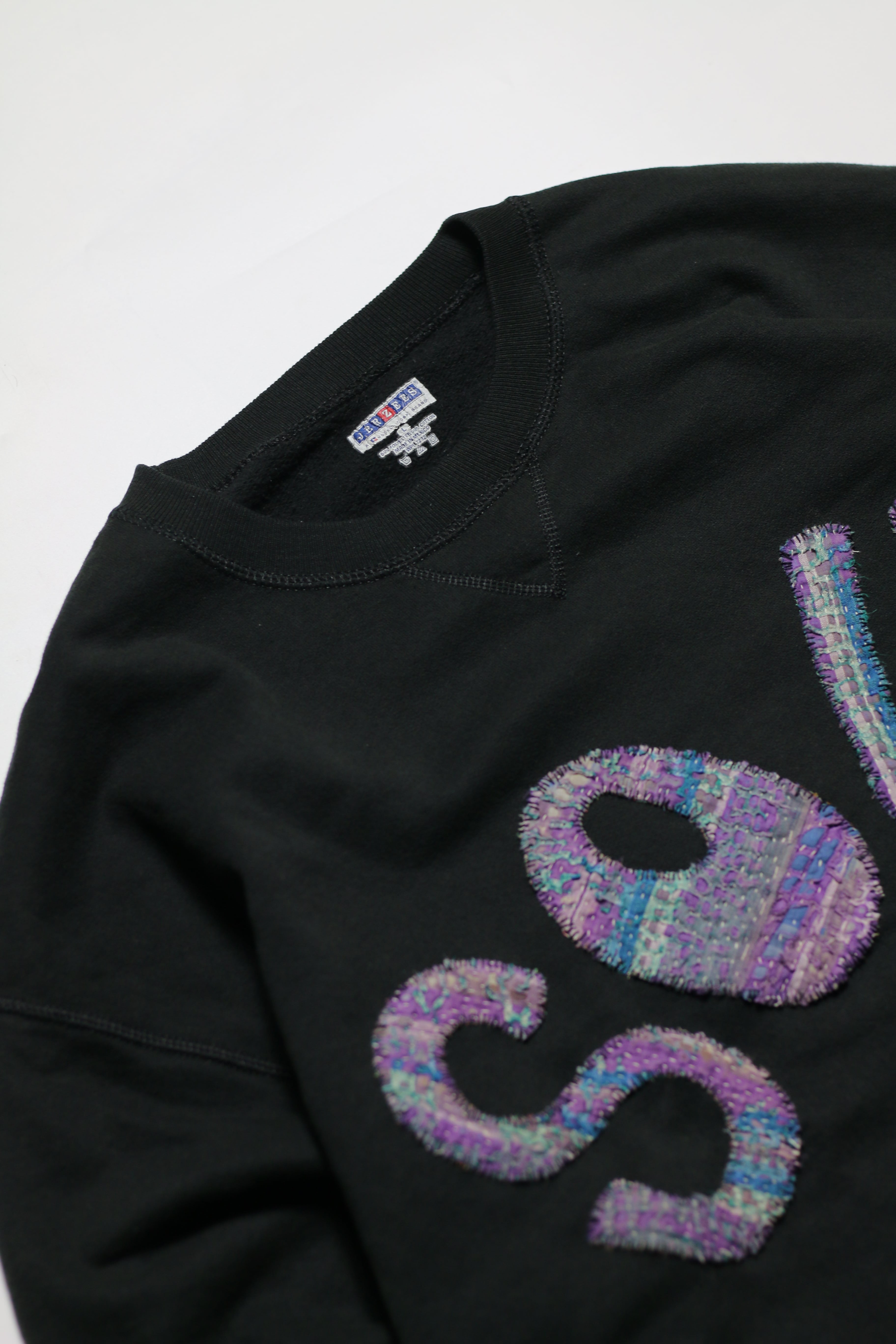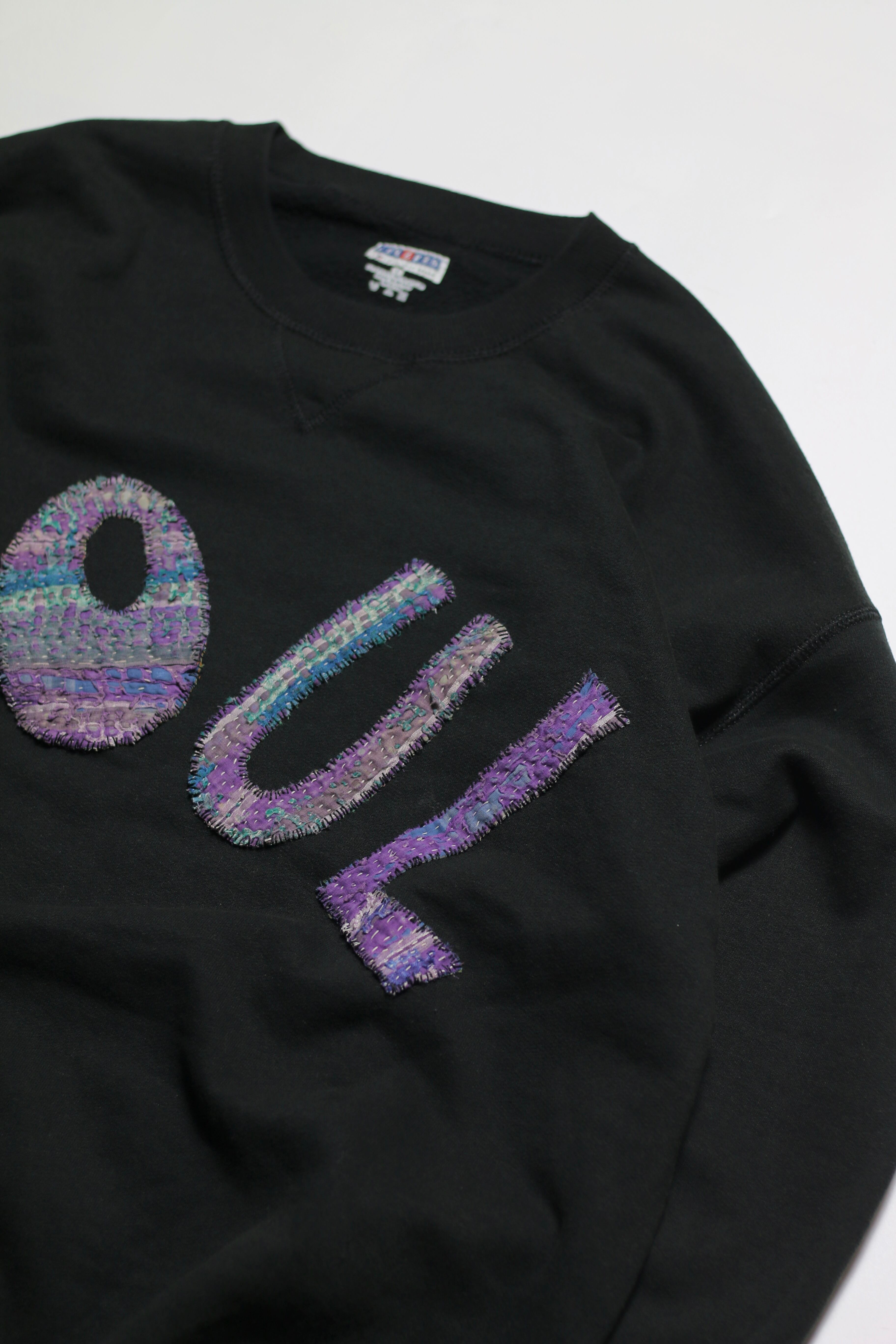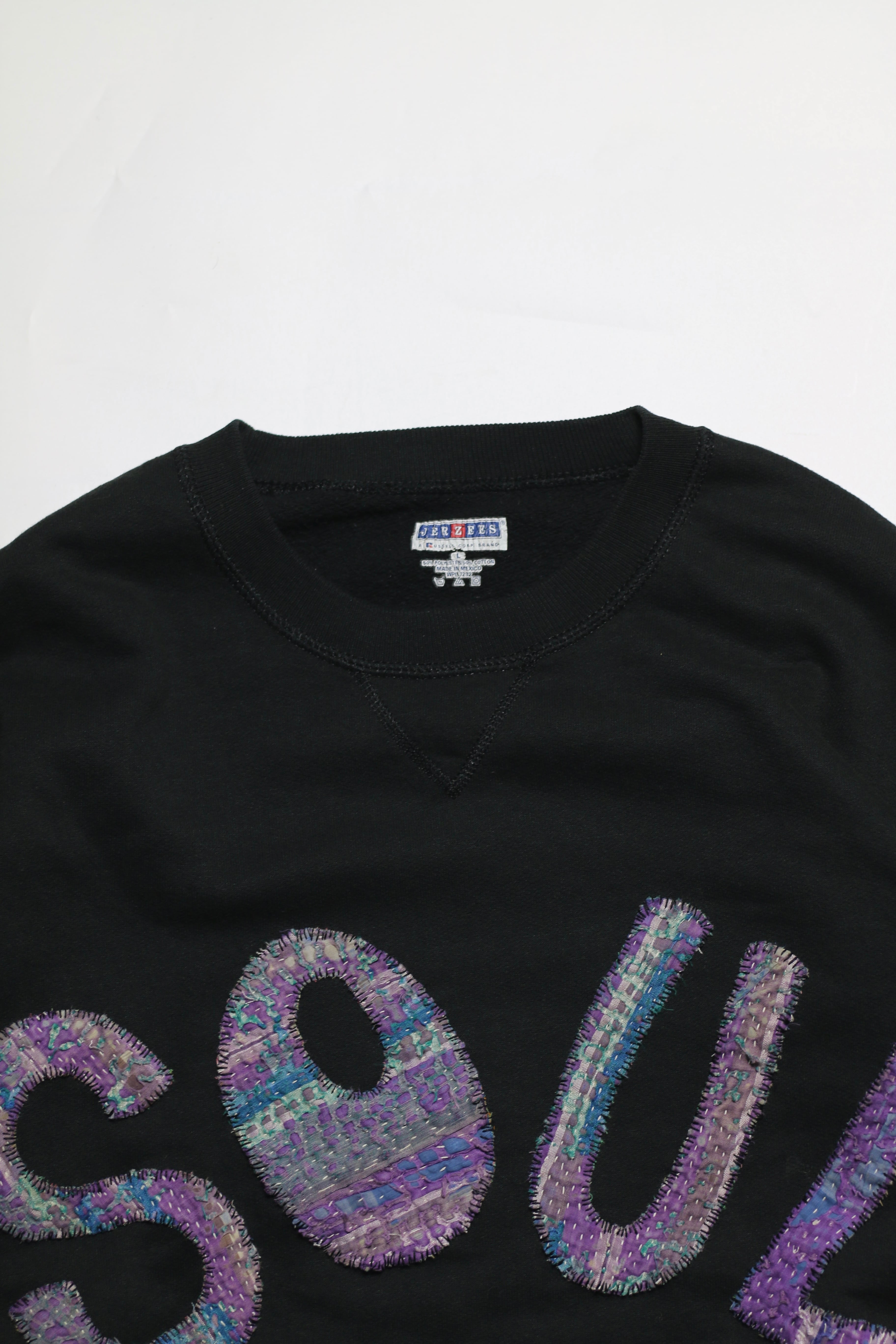 インド綿の端切れを捨てずにツギハギして作られた伝統的な刺し子刺繍生地カンタキルトをブラックの古スウェットに手縫いで縫い付けた一点モノです。
