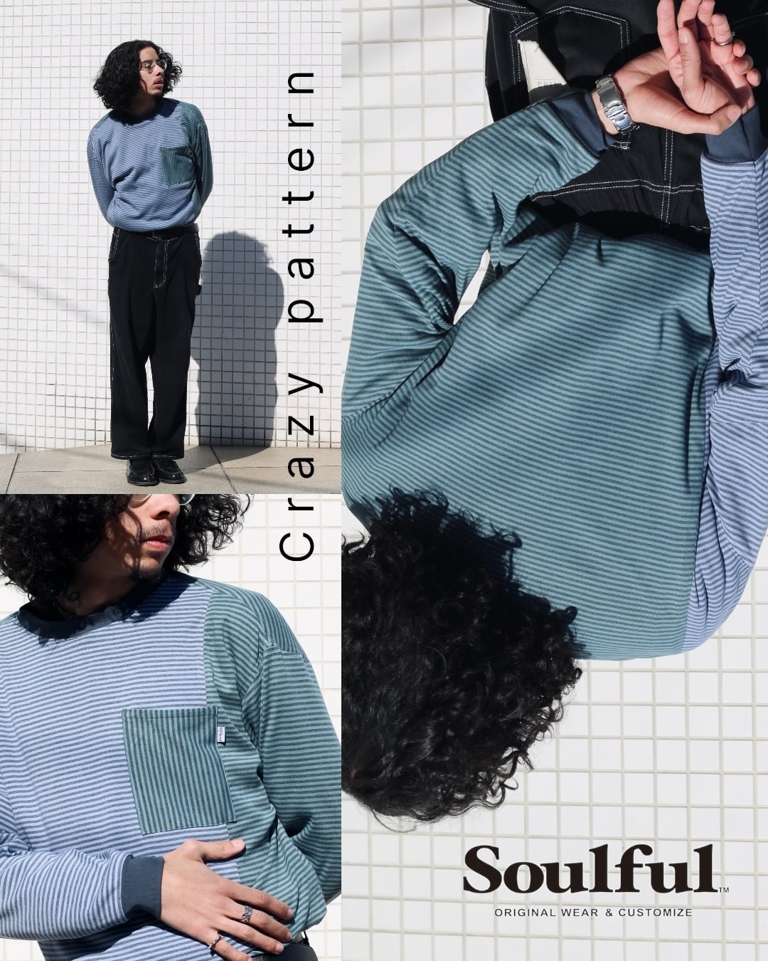 カジュアルで日常使いに適したピッチの細かいボーダーをクレイジーパターンにする事で程よくエッジの効いたデザインに仕上げております。