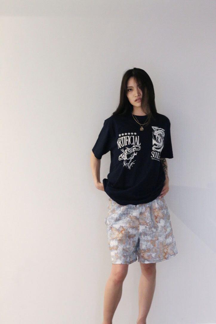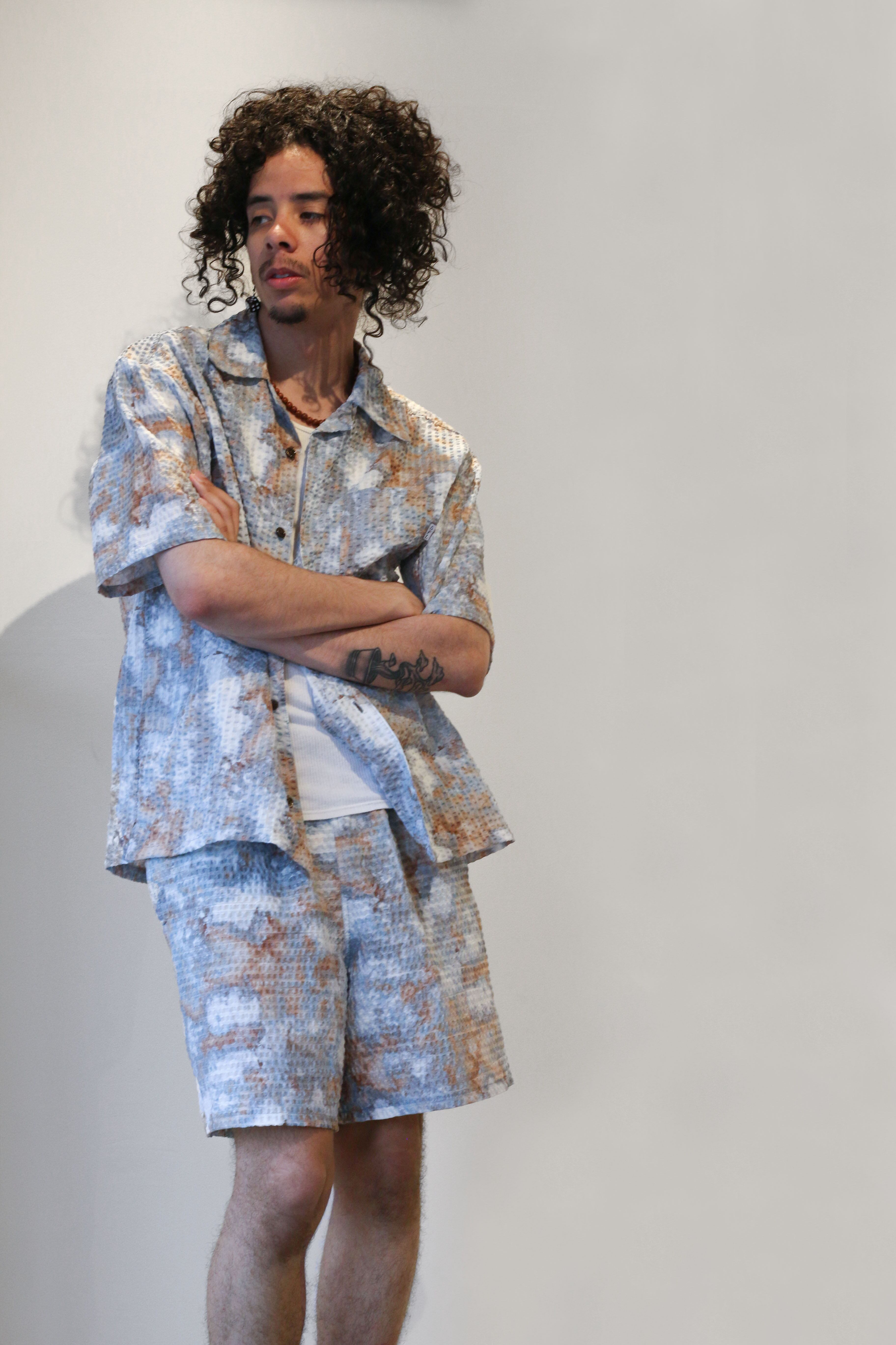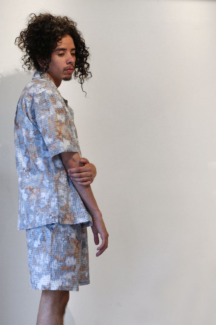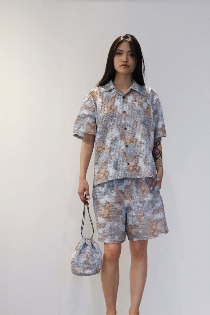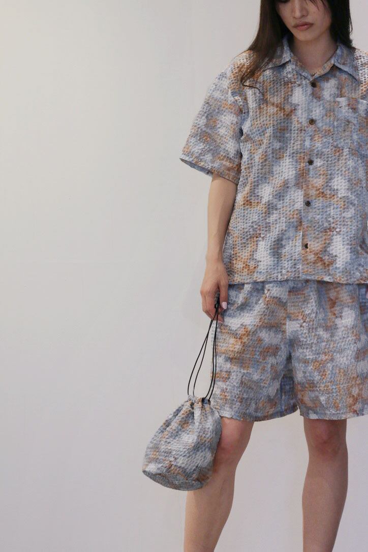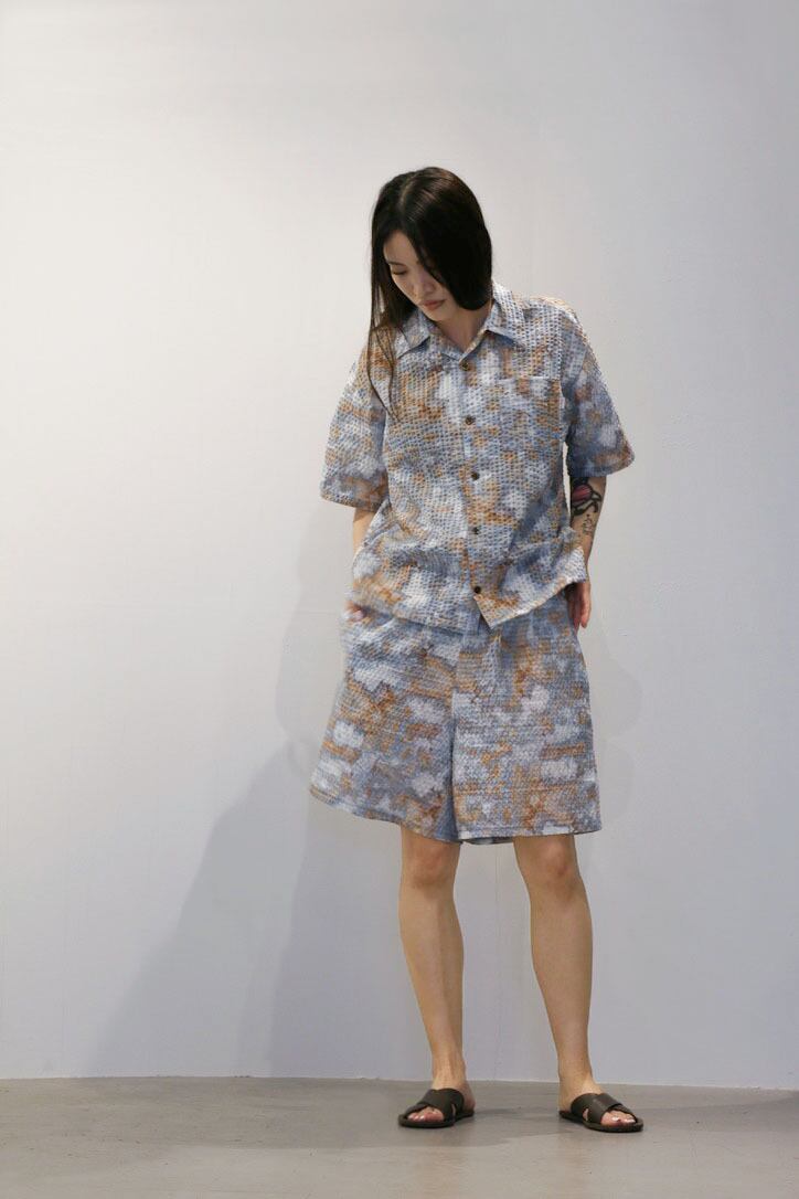 生地表面の凹凸感と涼しげな印象のムラ染め柄が映えるイージーショーツです。